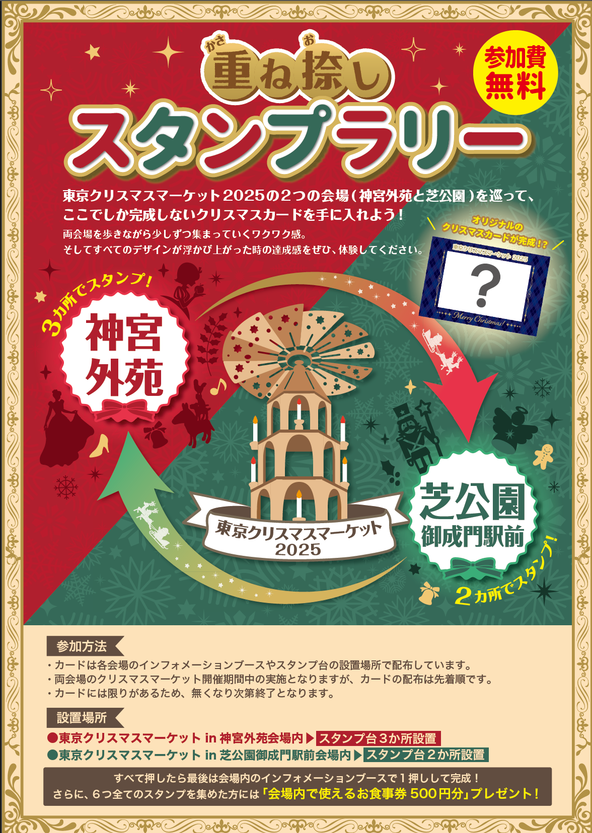 NEW超希少!シークレットカラーマグカップが登場【神宮外苑】 25.12.03 NEW日本工学院八王子専門学校の学生が「ヒュッテの屋根上装飾デザイン」を作成! 25.11.29 「1万円以上会場内でお買い物」で豪華景品が当たる抽選会を実施! 25.11.21 2つの会場を巡る「ARフォトフレーム」で思い出を残そう♪ 25.11.21 ワークショップで手作り体験。思い出のクリスマスグッズを作ろう♪ 25.11.14 クリスマスマーケットに「クランプスが出現!?」 25.11.12 「初代 JAPAN クリストキント」が決定! 25.11.12 北欧フィンランドのロヴァニエミにあるサンタクロース村からサンタクロースが来日!12/5芝公園の点灯式にも登場! 25.11.12 12月5日(金)芝公園会場の初日に「大谷映美里さん(=LOVE)」が点灯式に登場! 25.11.12 出店店舗情報&ステージスケジュール公開! 25.11.10 昨年大好評!VIPドームで優雅なひとときを♪今年はアフタヌーンティーも! 25.11.07 神宮外苑会場の初日に「CANDY TUNE」(キャンディーチューン)が登場! 25.11.05 事前予約チケット発売スタート♪ 25.10.21 2つの会場を巡礼して完成させよう♪クリスマススタンプラリー開催! 25.10.21 今年のマグカップのデザインを発表! 25.10.21 東京クリスマスマーケット2025 アルバイト募集 25.10.09 協賛企業募集 25.10.09 東京クリスマスマーケット 公式アンバサダー 初代“JAPANクリストキント”オーディション開催! 25.08.05 2025年度開催情報 25.08.05 出店者募集 ※終了しました※ 25.08.05 12月23日、24日、25日の3日間限定クリスマスケーキ付入場チケットが登場! 24.12.18 東京クリスマスマーケットの公式LINEができました! この度、公式LINE開設記念になんと!「マットブラック」のマグカップをプレゼント♪ 24.12.07 ブース番号6番「モエシャンドン」ブースでシャンパン購入のみでVIP Roomが使用できます! 24.12.05 総額100万円越え!会場内でのお買い物レシート総額5,000円以上で参加できる抽選会を会場内「インフォメーション」ブースで実施中! 24.12.05 東京クリスマスマーケットにスケートリンクが登場! 24.11.30 『クリスマスカード(アイナ・ジ・エンド)』イベント初日に初披露された様子を公開! 24.11.27 ワークショップで楽しもう! 24.11.25 東京クリスマスマーケットはVIPルームで暖かくゆったりと過ごそう! 24.11.22 5,000円のレシートでくじ引きにチャレンジ! 24.11.22 大人気!オリジナルアートマグカップで映えデコレーション!黒のマグカップはお店で買ってね! 24.11.22 郵便ポストはインフォメーション横、ザイフェンブースで買えば郵送無料 24.11.22 【東京クリスマスマーケットからのお知らせ】 24.11.18 クリスマスピラミッドがリニューアル! 24.11.14 ステージ情報公開! 24.11.13 オープニングセレモニー出演決定!東京クリスマスマーケット2024 イメージソング アイナ・ジ・エンド 「クリスマスカード」 (作詞・作曲:槇原敬之) 24.11.12 グルメ情報公開! 24.11.12 今年からWebでのチケット販売がTrip.comに変わりました! 24.11.11